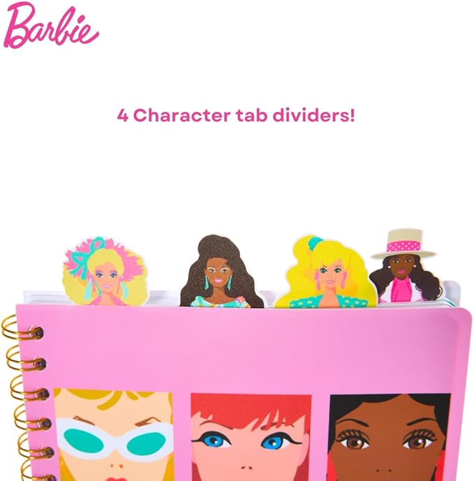 - BARBIE DOLL NOTEBOOK - Features lined pages with color images of iconic Barbie logo graphics on the corners, all your favorite barbie dolls on the cover, 4 color illustrated section dividers, and tab dividers