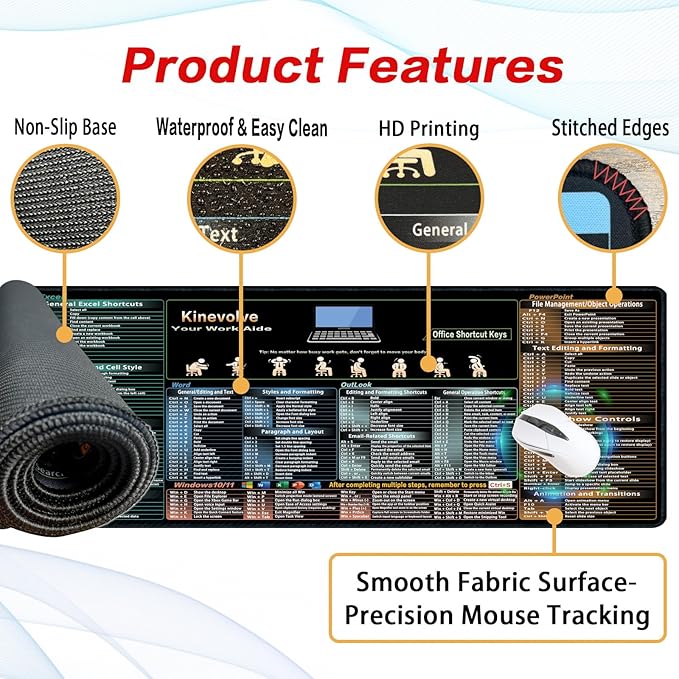 - Extensive Office Shortcut Collection: This mouse pad features a cheat sheet of shortcuts for Excel, Word, PowerPoint, Outlook, and Windows, helping to improve work speed and efficiency, making it perfect for both beginners and experienced users.