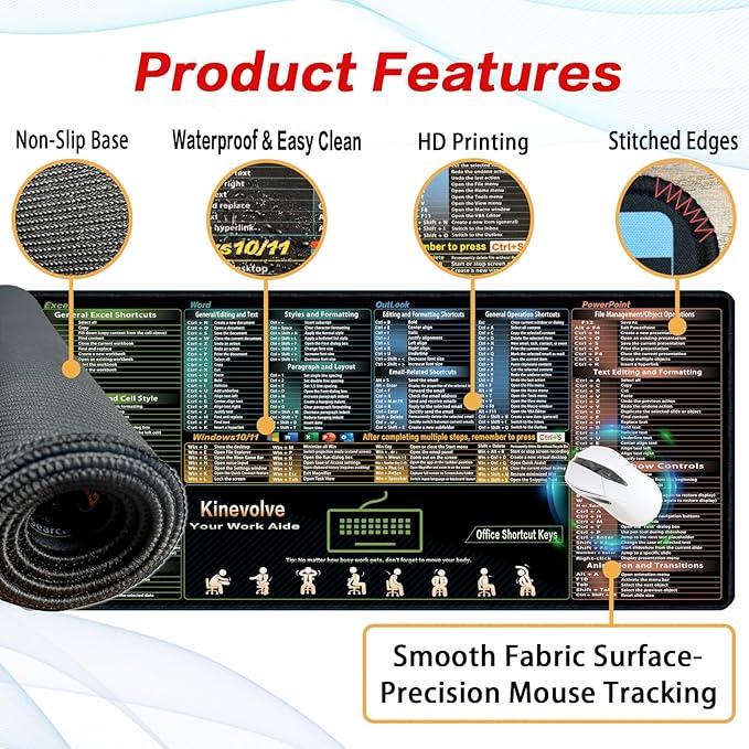 - Extensive Office Shortcut Collection: This mouse pad features a cheat sheet of shortcuts for Excel, Word, PowerPoint, Outlook, and Windows, helping to improve work speed and efficiency, making it perfect for both beginners and experienced users.