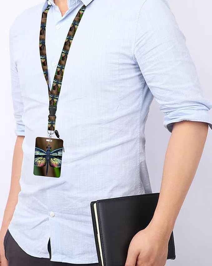 ID Badge Holder with Retractable Lanyard and Keychain, Badge Reel with Rotate Carabiner Clip,Cute Dragonfly Card Name Tag Lanyard ID Protector Bage Clips for Student, Women, Office