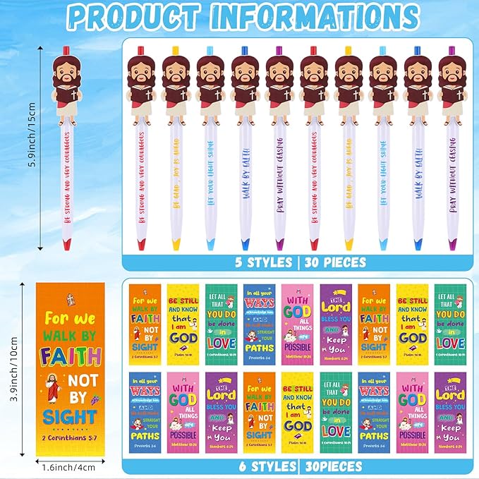 - Ample Quantity: you will receive 30 cute christian Jesus pens, colors include red, yellow, light blue, blue, purple and 30 colorful bible verse bookmarks in 6 different styles, enough to meet your needs and replacement, you can share with others