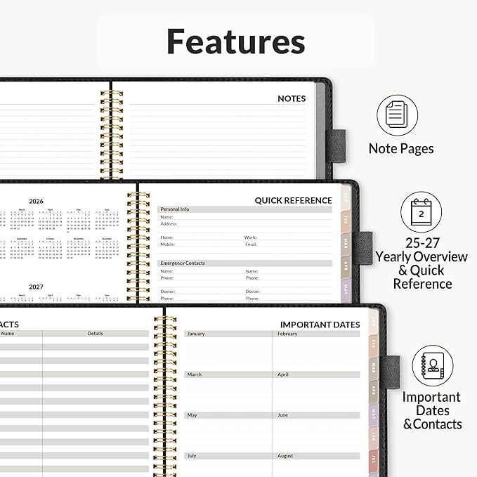 - Additional Features - The weekly planner includes 2026-2028 calendars, year schedule for full year 2026, holiday lists, contact pages, notes pages, important dates, and US time zone map. Beautiful monthly tabs simplify navigation and add a stylish, playful element to the planner's aesthetic.