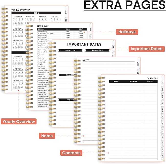 - Functionality Perfected, Style Exemplified: Revel in the embrace of 8.5" x 11" 2026 planner weekly and monthly, thick paper that exudes quality, and a hardcover cover adapting seamlessly to your lifestyle. Let monthly tabs and strong twin-wire binding elevate your planning journey, while the elastic band adds convenience for easy use. Contacts, a 2026 Yearly Overview, Reference Calendars, and 2026 Holidays enrich your journey.