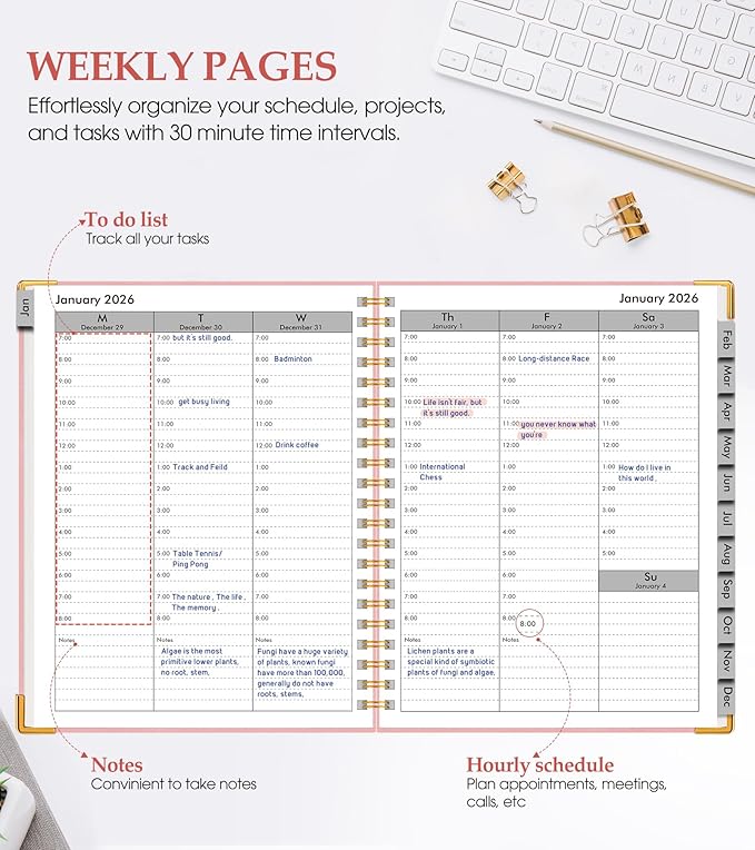 - 【2026 Planner Overview】From January 2026 - December 2026, providing a fresh start for a year! Our 2026 daily schedule planner envelops 12 months with a harmonious blend of monthly and weekly planning pages. Ensuring you're prepared for every month and week ahead. Including 12 monthly tabs allow for quick navigation, easy year-round planning. 5.75” x 8.38” a5 medium size offers ample writing space, great calendar planner to keep track of your school, work goals, appointments, agenda, and day. Note: There may be some color differences due to different shooting lights or displays.